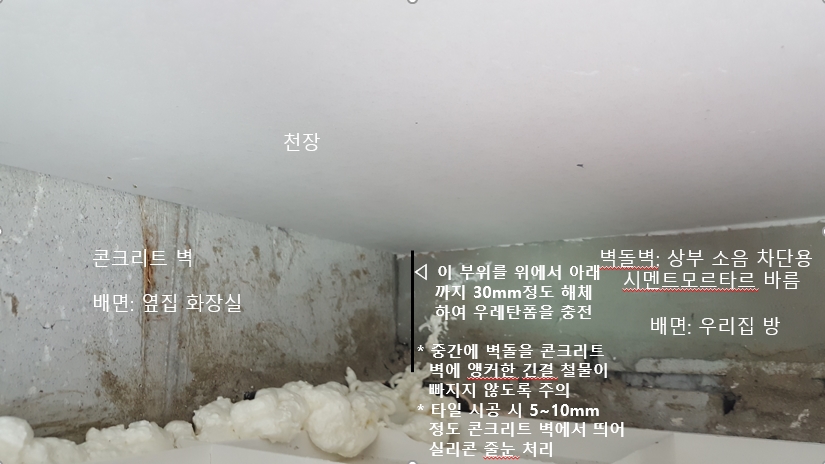 (천장은 틈새로 인한 문제가 있는게 100%확실하니 미장을 해보고 그래도 방음이 안되면, 하단의 화장실 벽체가 문제일테니 화장실 공사를 하려고 합니다)