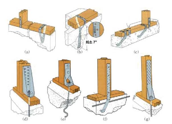 김인호님 자료는 현공정에서 적용하기 불가합니다.토대목과 샛기둥을 연결하는 철물이 있기는하나 안타깝게도 국내에 들어와 있지않습니다.이미 밖으로 돌출된 토대목을 그대로 둔다면 관리자님 말씀대로 내부에서 연결철물을 적용할 수 밖에 없습니다.토대와 스터드를 연결할 수 있는 'ㅗ"형태의 철물을 구해서 40mm 해어네일로 처리할 수 밖에 없습니다.어째든 지름길이아닌 꼬불꼬불 오솔길이네요.
