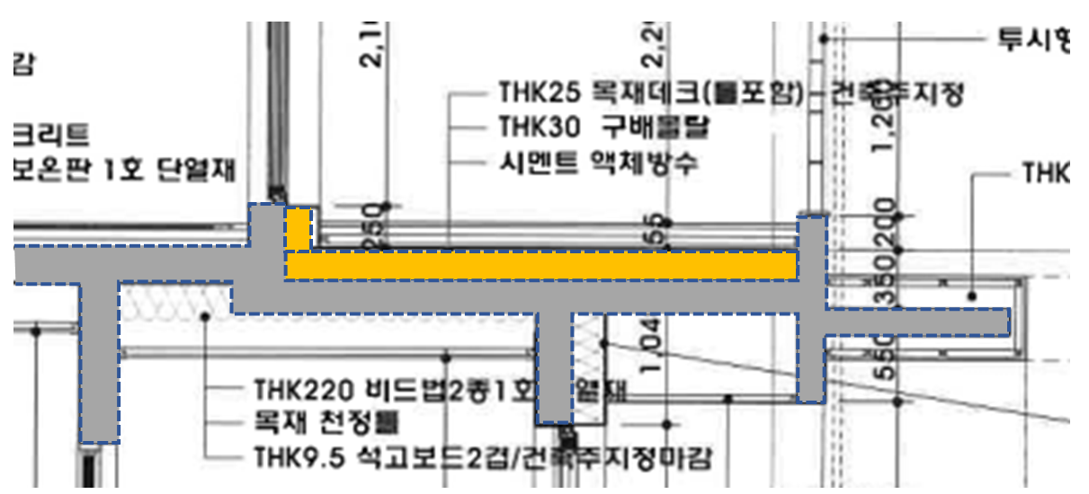 그러나 제가 건축에 문외한인 관계로 현관 개구부나 테라스 부위의 열교가 발생하는 부분에 대해서는 해결 방법을 고민하고 있으나 정답을 찾지는 못하고 있습니다. 첨부한 단면도에서 테라스 위쪽의 슬라브 지붕은 삭제하였으며 테라스 바닥은 역전 방수를 하려고 합니다.