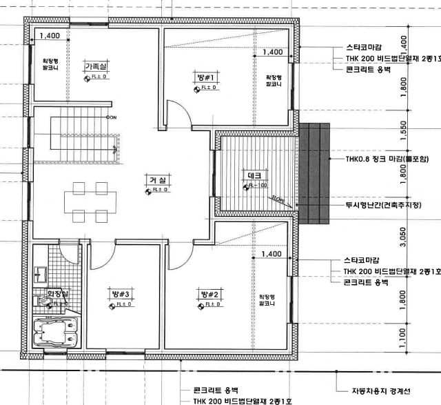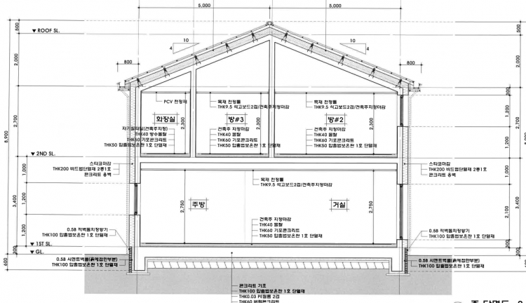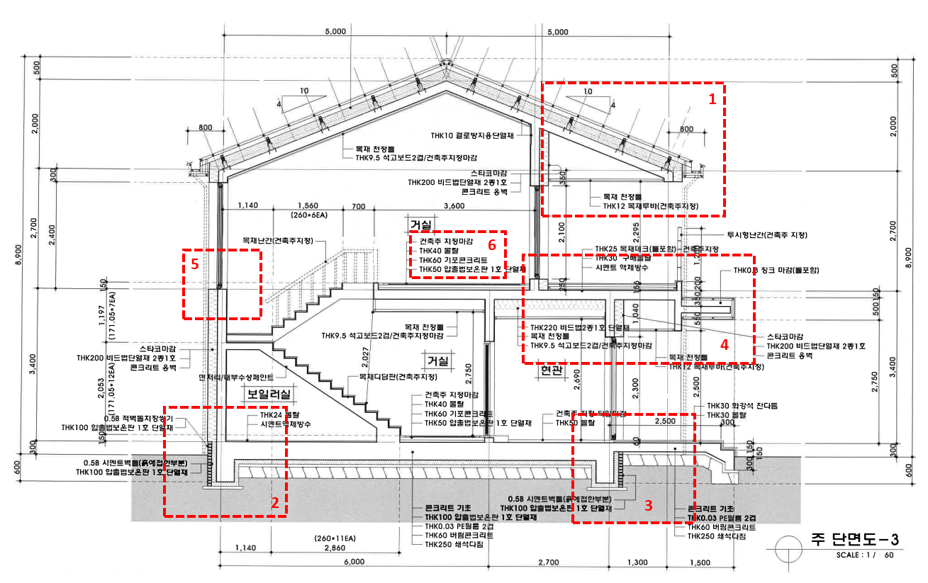 2)외벽단열 : 비드법 단열재 200mm 외단열 기초단열 : 100mm 압출법 보온판