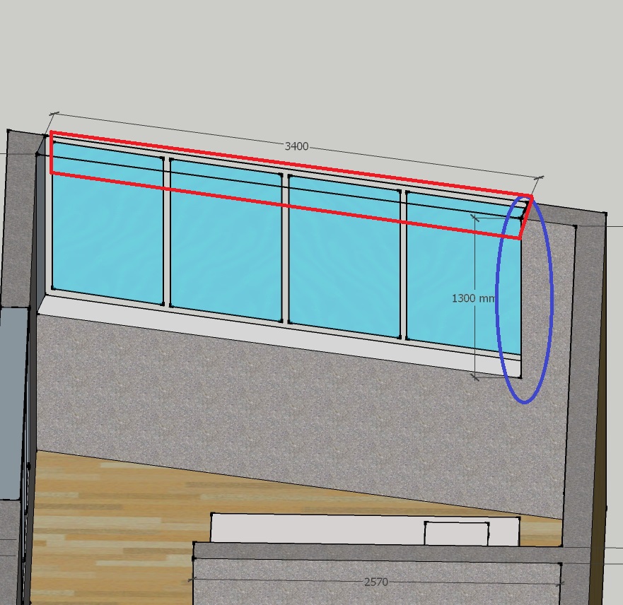 그래서 빨간색 표시된 창틀 윗쪽200mm정도를 공틀로 채우면 창호 열리는 사이즈가 1200mm정도 되면 창호 열고 닫는게 좀 더 편하지 않을까 해서요