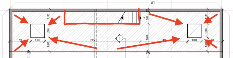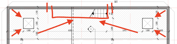 중정의 상세 그림은 다음과 같습니다. 3mX15m의 공간이며 양쪽에 1mX1m의 구멍이 뚫려있습니다.(그림1) 바닥은 전체 매트기초입니다. 그중 계단 하부는 보일러실로, 그 면적만큼의 바닥에 단열재를 또 깐 뒤 그 위에 콘크리트로 별도로 매트를 만들어 바닥으로 사용하며 그위가 보일러실이 되고 보일러실의 벽은 컬러강판 마감 후 내부에 뿜칠 단열재시공하는것이 최초 계획이었으나 이후 패시브창호로 변경되었습니다. 즉 이부분은 벌레 등이 들어오지 않는 밀폐/격리공간입니다.