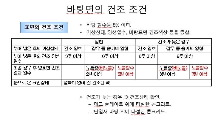 콘크리트 바탕 방수시기에 대한 일반적 기준입니다.