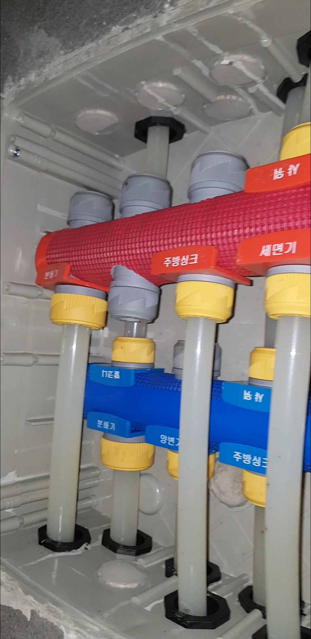 호스 들은 온수/냉수 분배기 이고, 당해 세대 용입니다. 이 것을 통해 다른 세대의 냄새가 유입될 수는 없습니다.