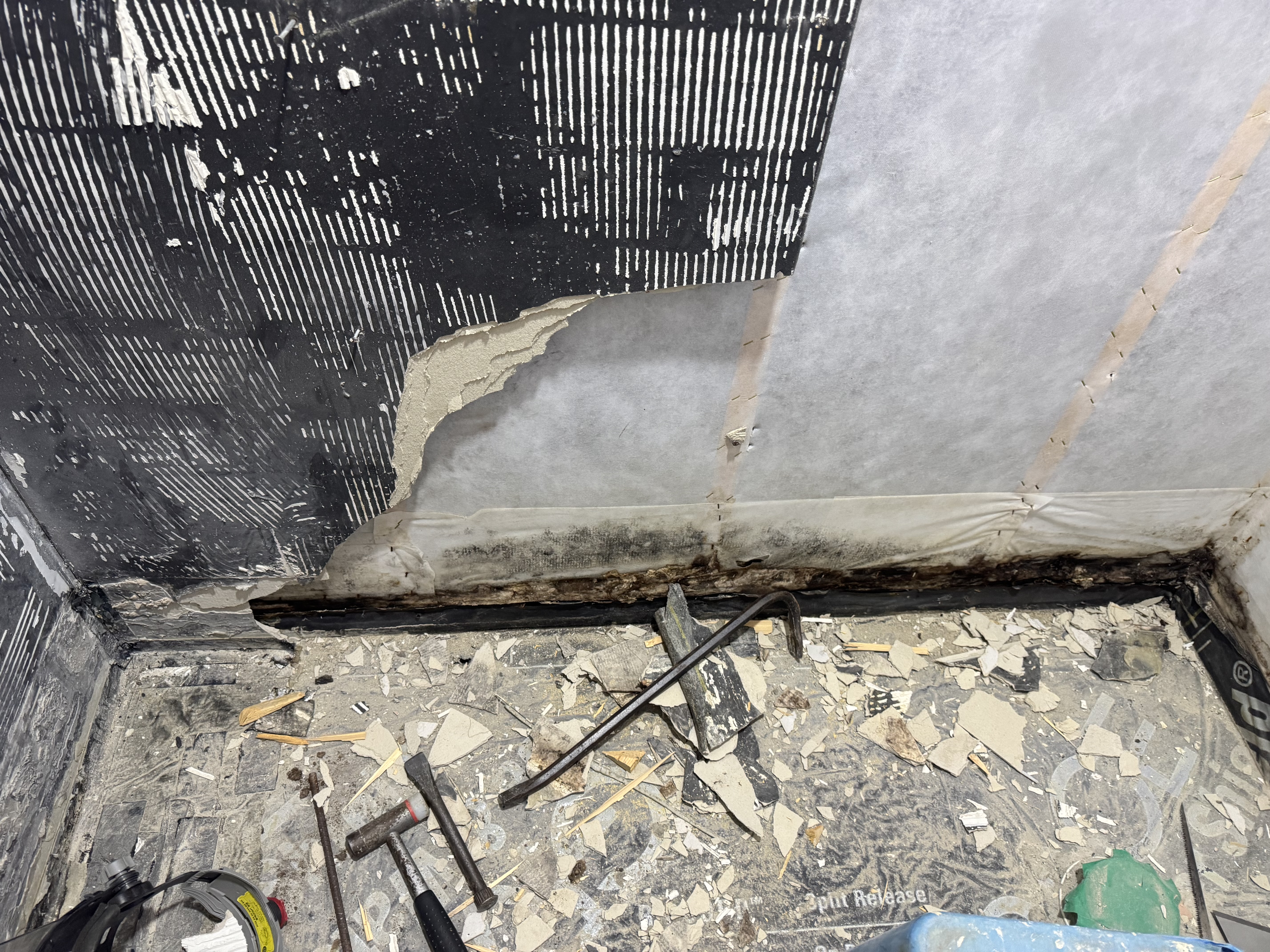 바닥의 방수층과 벽의 방수층이 이어진 것이 아닌 것 같습니다. (바닥을 먼저 시공하고, 벽의 석고보드를 치고 다시 방수)