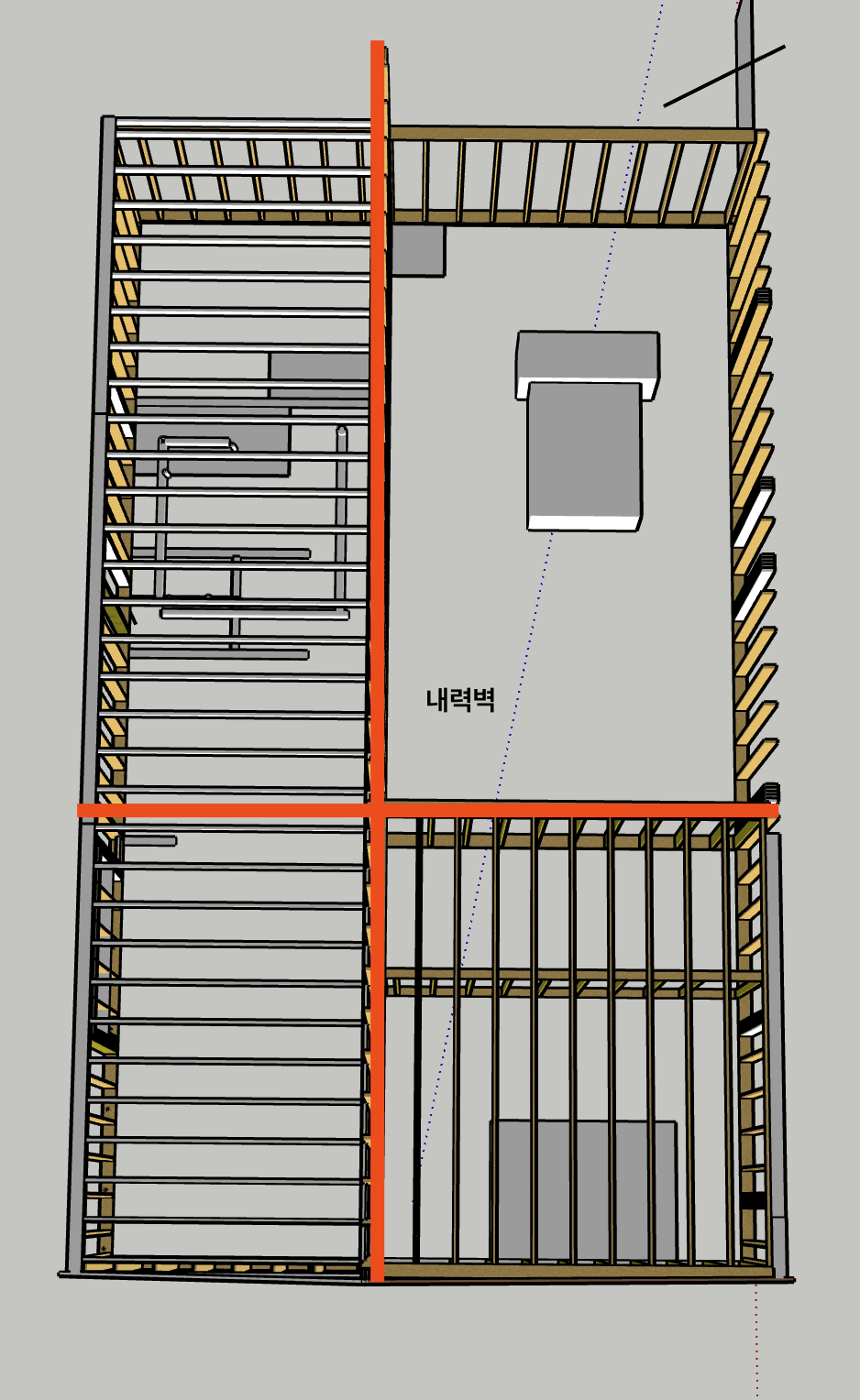 오픈천장이 있어 릿지빔위에 서까래를 올려서 릿지빔을 받치는 내력벽에 하중을 많이 받고 비대칭 지붕이어서 남쪽 서까래가 길어 남쪽 외벽이 하중을 많이 받을 거 같습니다.