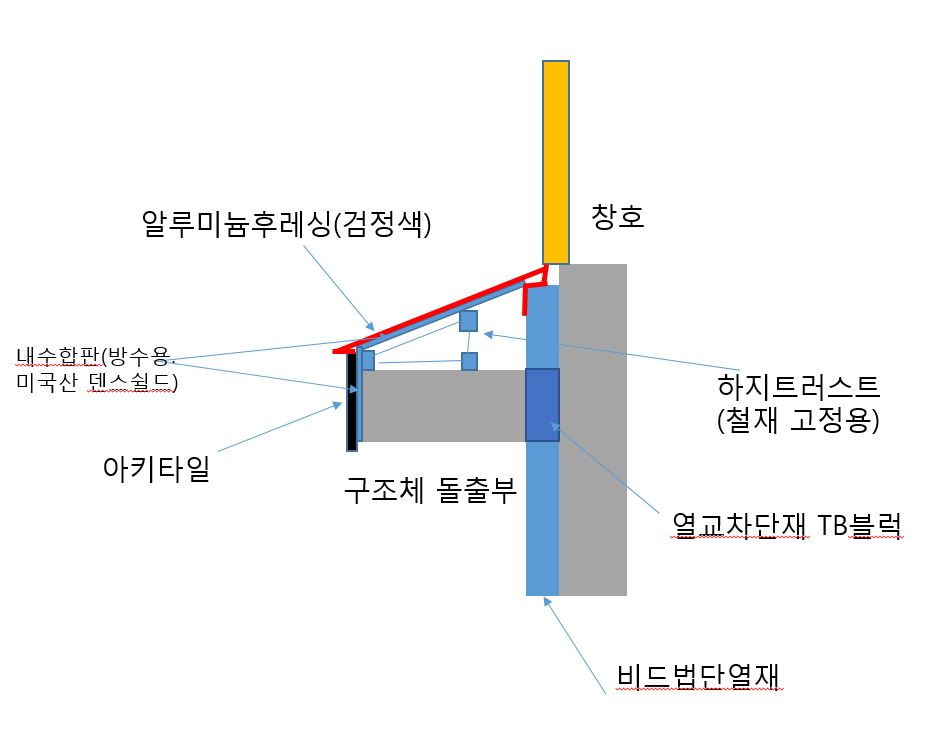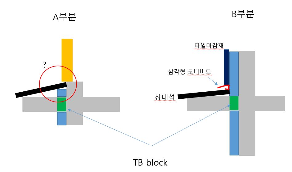 돌출부가 곡면으로 돌면서 처마 역할까지 해서 돌출부를 포기하기는 어렵습니다. TB블럭을 고려한다면 제 생각에 B부분은  그림처럼 시공하면 누수와 열교에 좋은 방법인가요? 그럼 A 부분은 어떤 디테일로 누수와 열교를 잡을 수 있나요?  A와B의 창대석 높이와 경사 레벨은 동일했으면 합니다(제가 그림으로 모든 표현은 안되어서 죄송합니다)