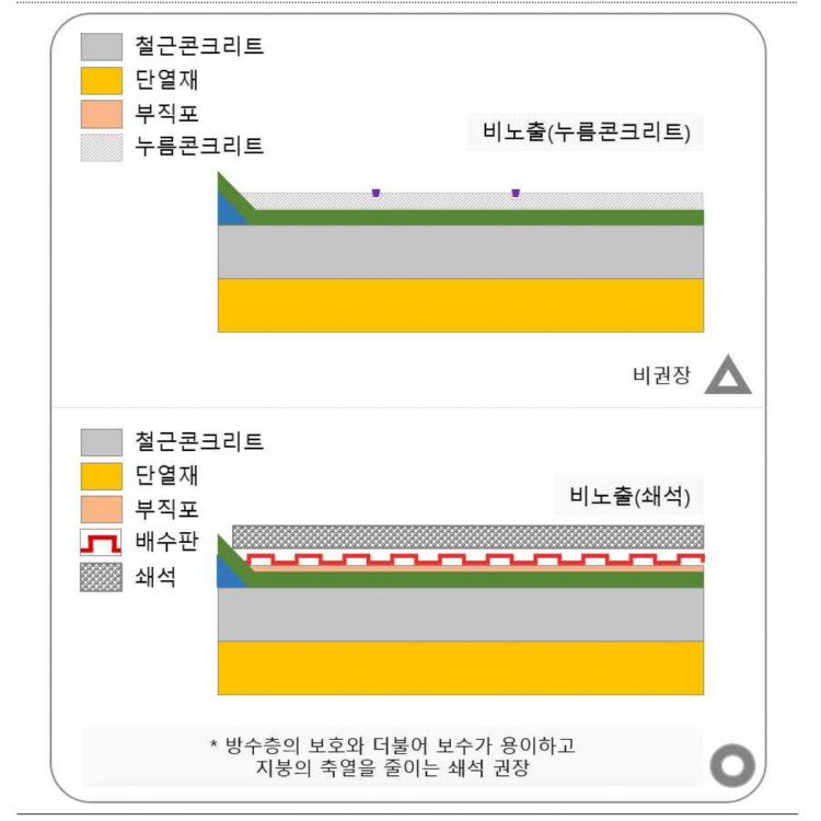 그래서 최소한의 조치로 그 방수층이 자외선에 직접 노출되지 않는 방식을 채택해야 한다는 뜻이었습니다.
