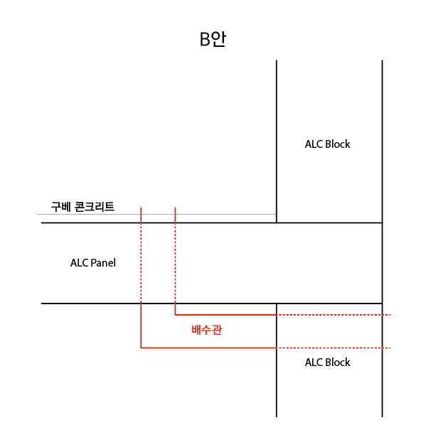 자세히 설명하면 A안은 옥상에서 바로 배수처리되는 것이고 B안은 패널을 뚫고 실내로 들어와서 외벽으로 배수되는 방식입니다.