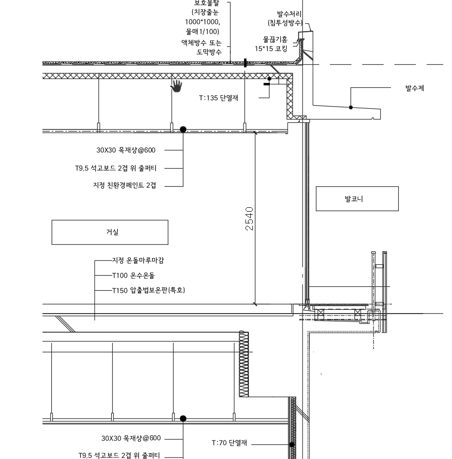 발코니 부분에 배리어 프리 +유리 난간 발코니로 하면 단차를 없앨 수 있다고 하여 위와같이 그렸는데 이 같은 경우 배수나 단열은 어떻게 단면에서 처리해야하는지 여쭙습니다