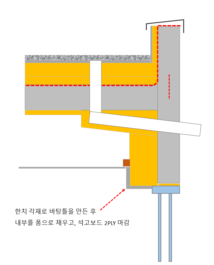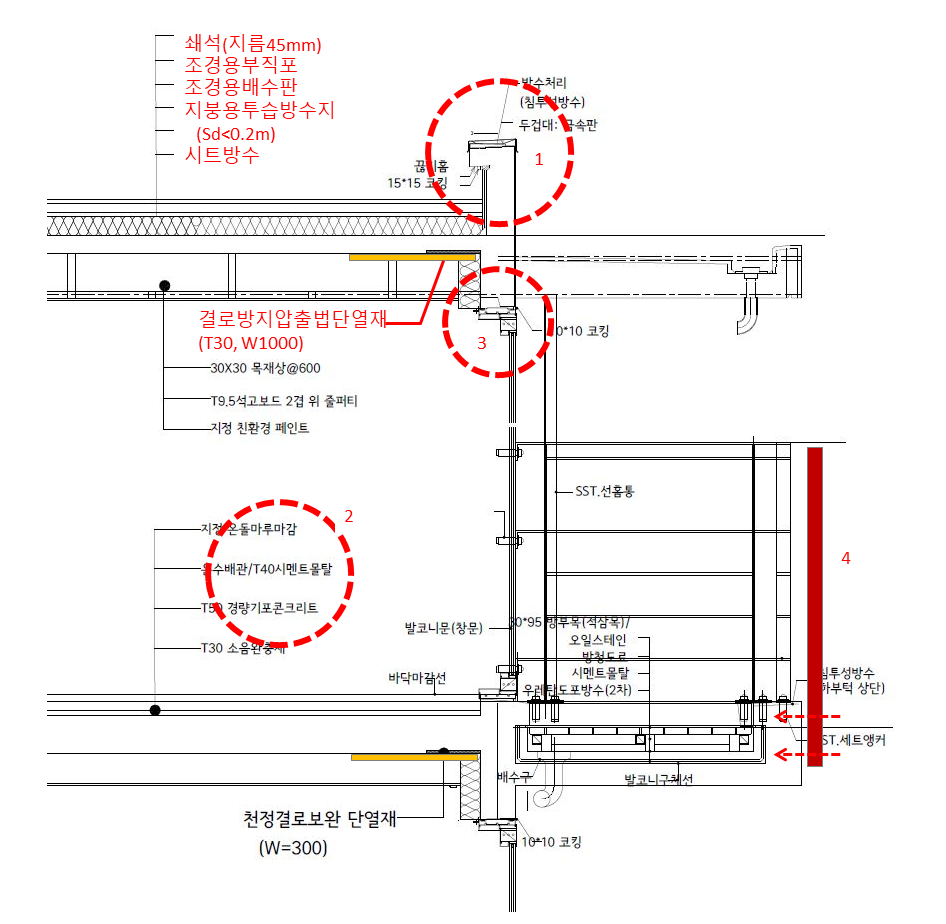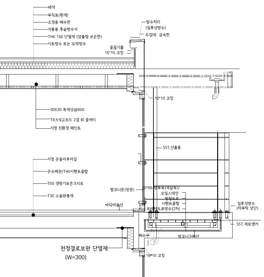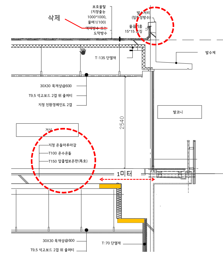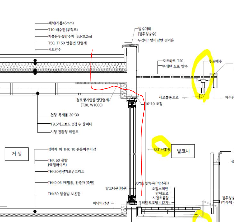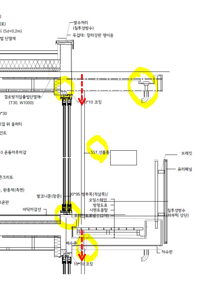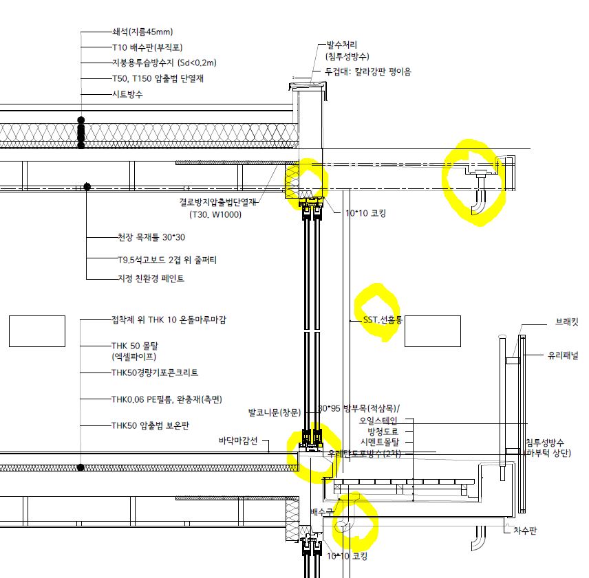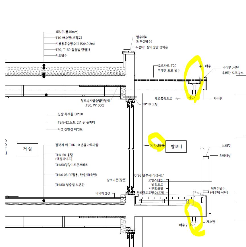 자세한 답변 감사드립니다. 말씀하신걸 바탕으로 수정하였습니다. 하지만 루프드레인의 위치, 배수가 채양이있는 발코니부분에서는 어떻게  될까요? 노란색 동그라미친부분들을 어떻게 처리해야할 지 모르겠습니다. 또한 발코니부분의 단열은 내외부를 어떻게 처리해야하나요? 노출콘크리트주택이고 내단열이고 6층 (옥탑층)입니다. 감사합니다