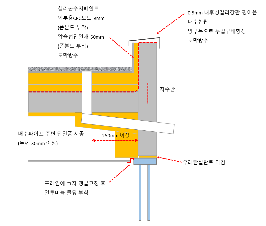 나머지 물처리 등은 크게 무리가 없어 보입니다. 다만, 발코니의 배수구는 외부측이 아닌, 안쪽으로 구배를 잡는 것이 좋습니다.