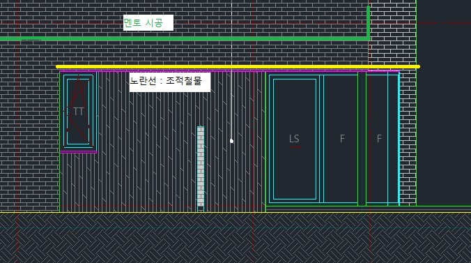 방안2. 사진에서 보이는 앵글 위의 단열재에서 1000mm 상부까지 내려온 멘토를 앵글을 덮고 아래 pf보드까지 연장해서 수분의 흡수를 막는다. 다만, 이럴경우 멘토위에 조적이 될텐데 문제가 없는지 모르겠습니다. 또한 pf보드 아래쪽을 10mm정도 잘라내고 소달폼으로 채워서 앵글로부터 물흡수를 차단한다.