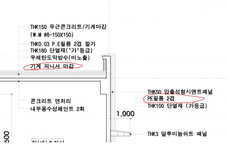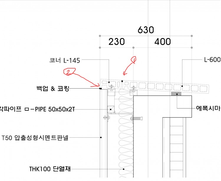 또한 옥상 파라펫 상세에 대한 질문입니다. 상세를 저렇게 해서 왔는데요.. 파라펫의 상층부분 (1번)은