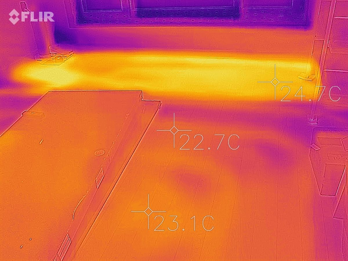 [조건 : 보일러 가동(30도 이하)후에 끄고 3시간 후에 측정한 열화상 카메라(FLIR 아이폰용)/필로티구조 2층]