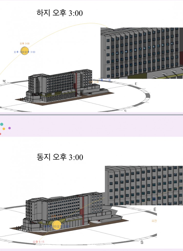 그림1.은 유닛을 남향으로 일부러 꺾어 일조의 유입정도를 확인해보았습니다. 여름철 오후 1:30 ~ 3:00 유닛배치를 꺾음을 통해 그림자가 생기는걸 알수있어 여름철 냉방부하를 저감할수있을것이라 생각했습니다. 또한 겨울철은 태양고도가 낮고 위치상으로 그림자가 들지 않는걸 확인하여 여름철은 냉방부하를 감소하고 겨울철은 난방부하를 감소할수있을거라 생각했습니다.