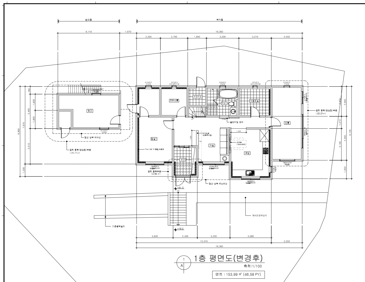 대수선과 증축이라 하셨는데, 기존과 새로 붙는 부분의 경계를 알아야 될 것 같습니다. 즉 올려 주신 도면에서 어디까지가 기존인지를 잘 모르겠습니다.