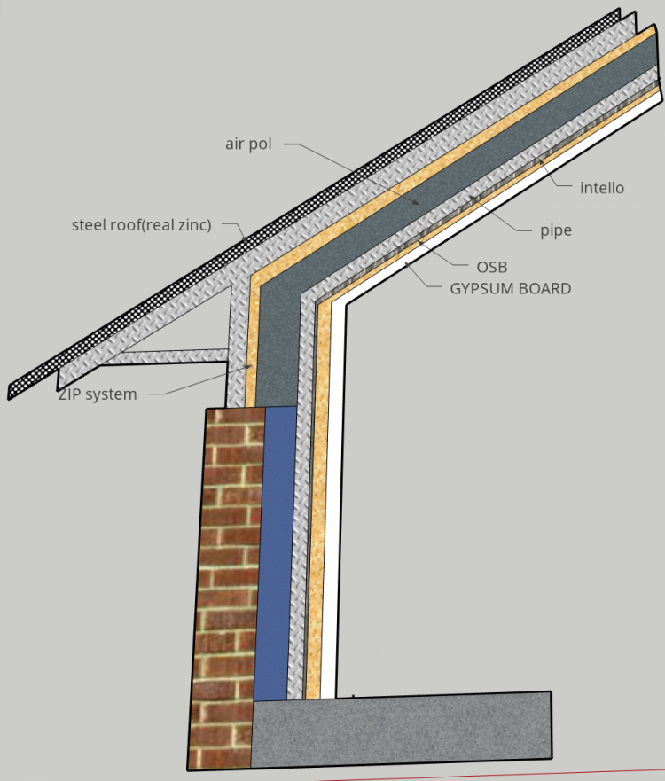 내측 사각파이프구조물 --> intello --> 에어폴 --> 외측 구조물 --> zip 합판 ---> 통기층 -->(합판)징크마감 순서입니다.
