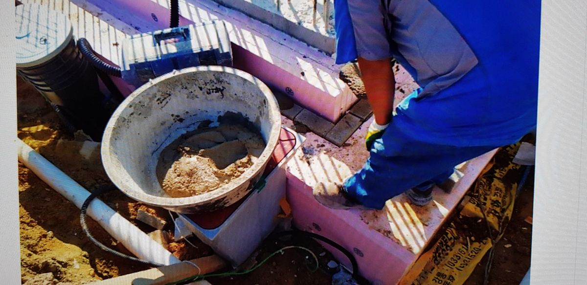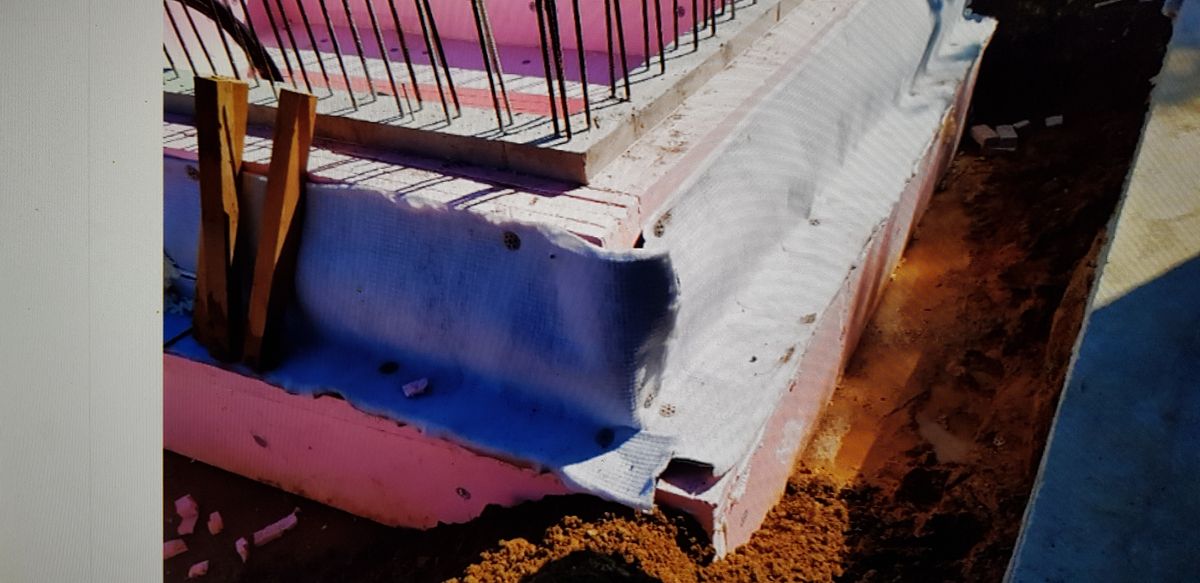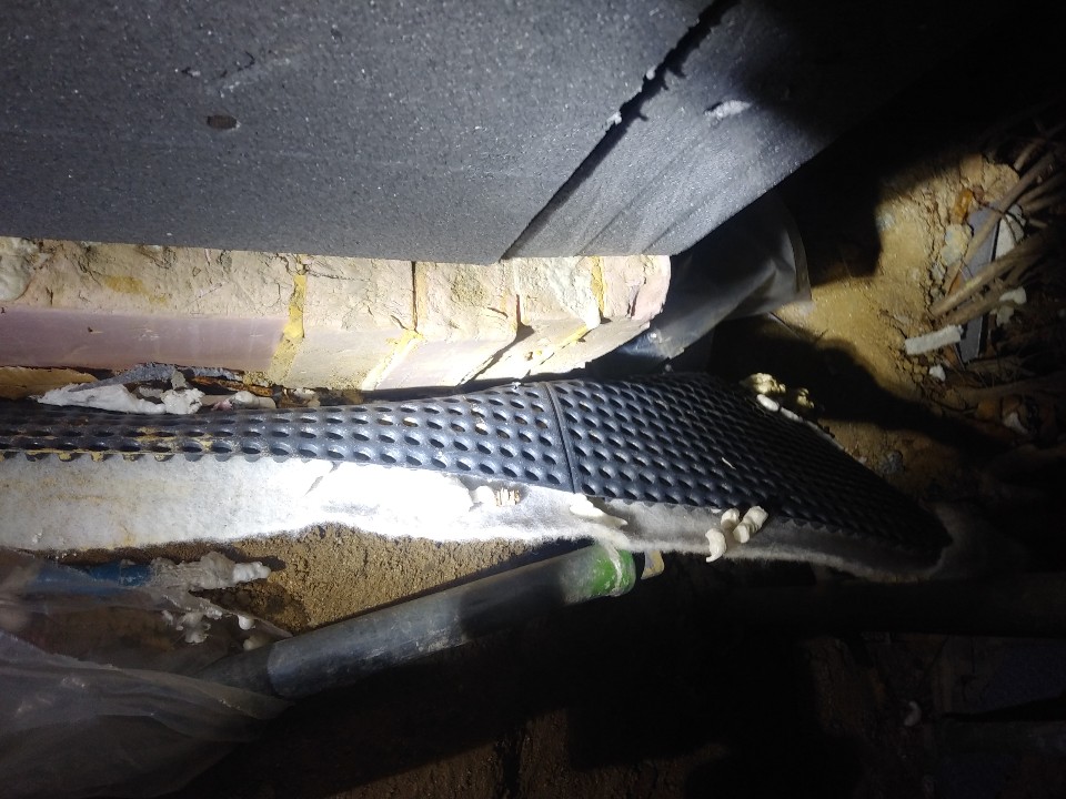 지표면 아래에서 시멘트 벽돌을 기단부로부터 조적하고 드레인보드로 시멘트벽돌을 덮었습니다. 드레인보드는 시멘트벽돌위에서 시작하여 지표면 아래 줄기초에 시공한 외단열재 상부까지 덮었습니다.