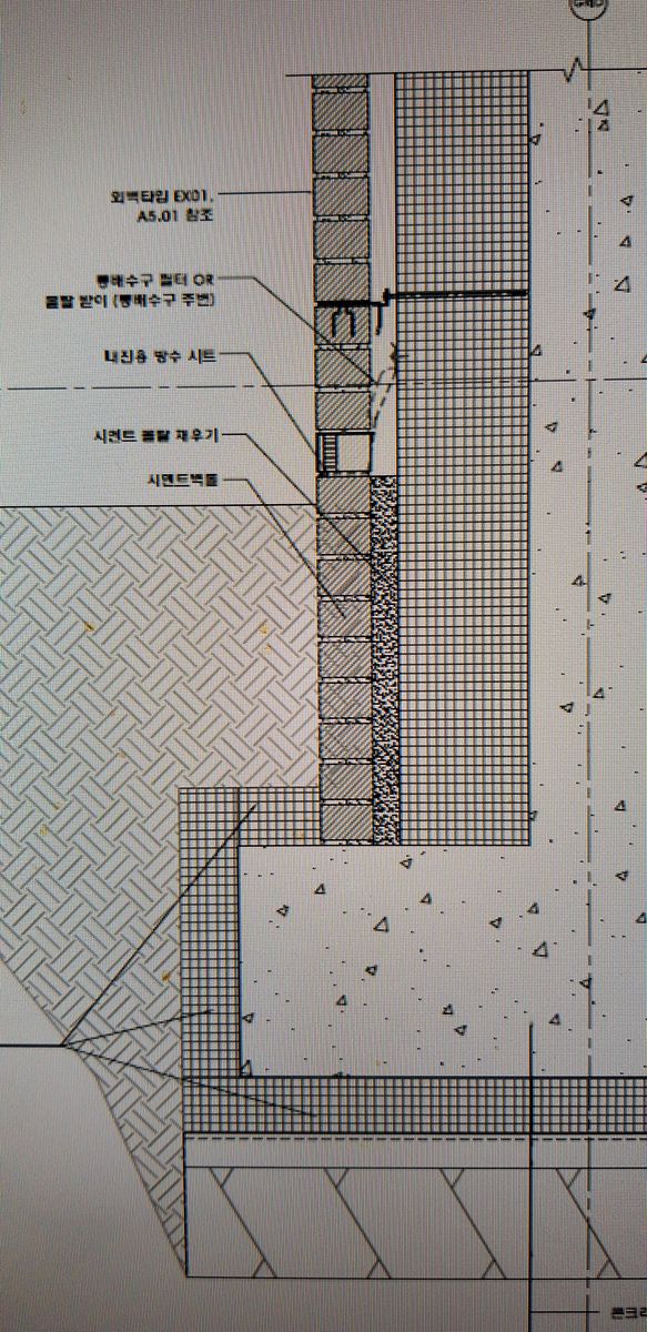 단면을 보니.. 기초턱에 조적을 올린 것이며, 1층 바닥레벨보다는 한참 아래이므로 1층으로의 누수와는 아무 상관없습니다. 즉 제가 위에 설명드린 그 모든 것이 다 맞지 않는 설명입니다.
