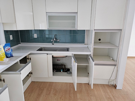세탁기를 설치하는 베란다에 철문(비트)를 통해 세대에 들어오는 메인 벨브가 확인 가능하고 세탁실과 주방의 벽을 두고 바닥으로 가지관이 시멘트에 매립되어 들어오고 있는 구조 입니다.