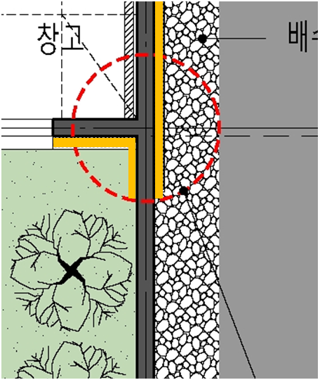 나. 위의 공정 중에 어긋나거나 건전성을 잃을 확률이 있다면 바닥의 물을 외부로 빼야 하는데, 말씀드린 바와 같이 1층이 외기와 면하여 있기에, 바닥과 외벽이 만나는 모서리에 배수로를 만들고 그 곳에 고일 수 있는 물을 1층 외부로 뺄 수 있는 작은 파이프만 매립하면 무리가 없어 보입니다.