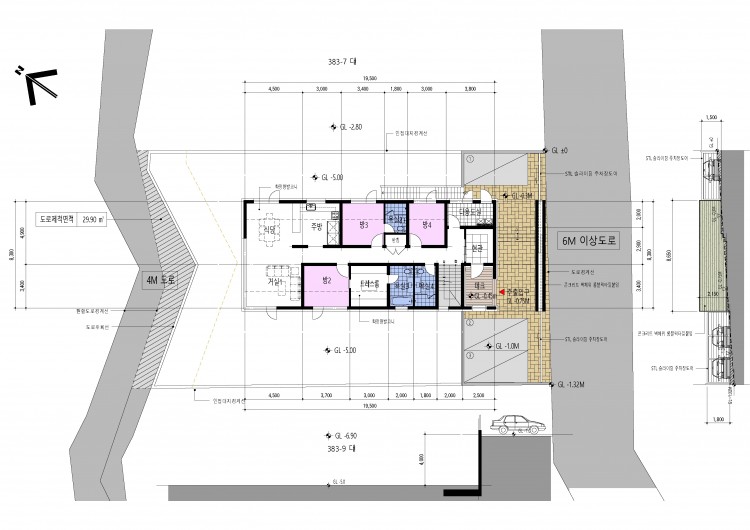 도로가 높은 대지 특성상 1층이면서도 한쪽면이 흙에 접하는 부분에