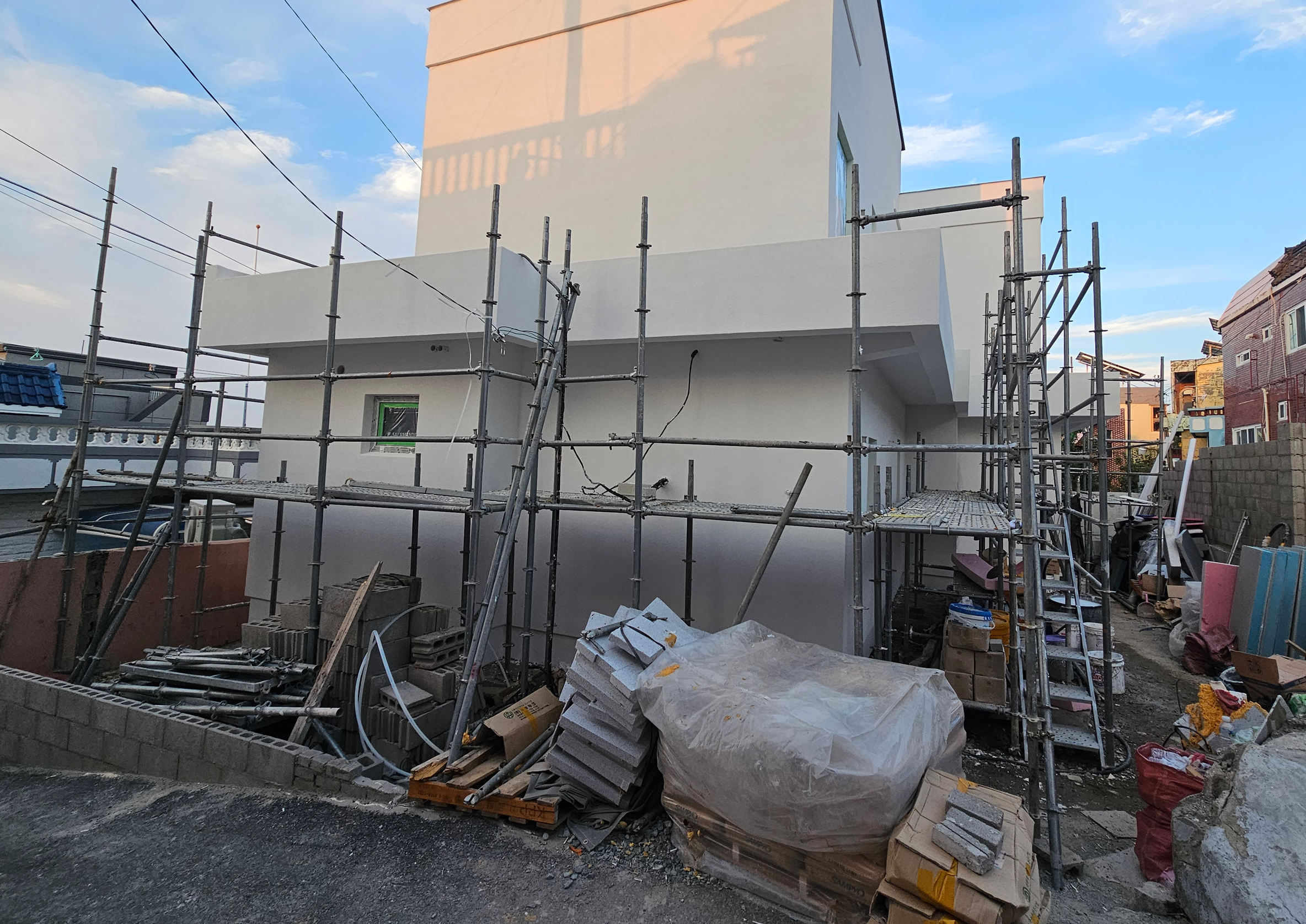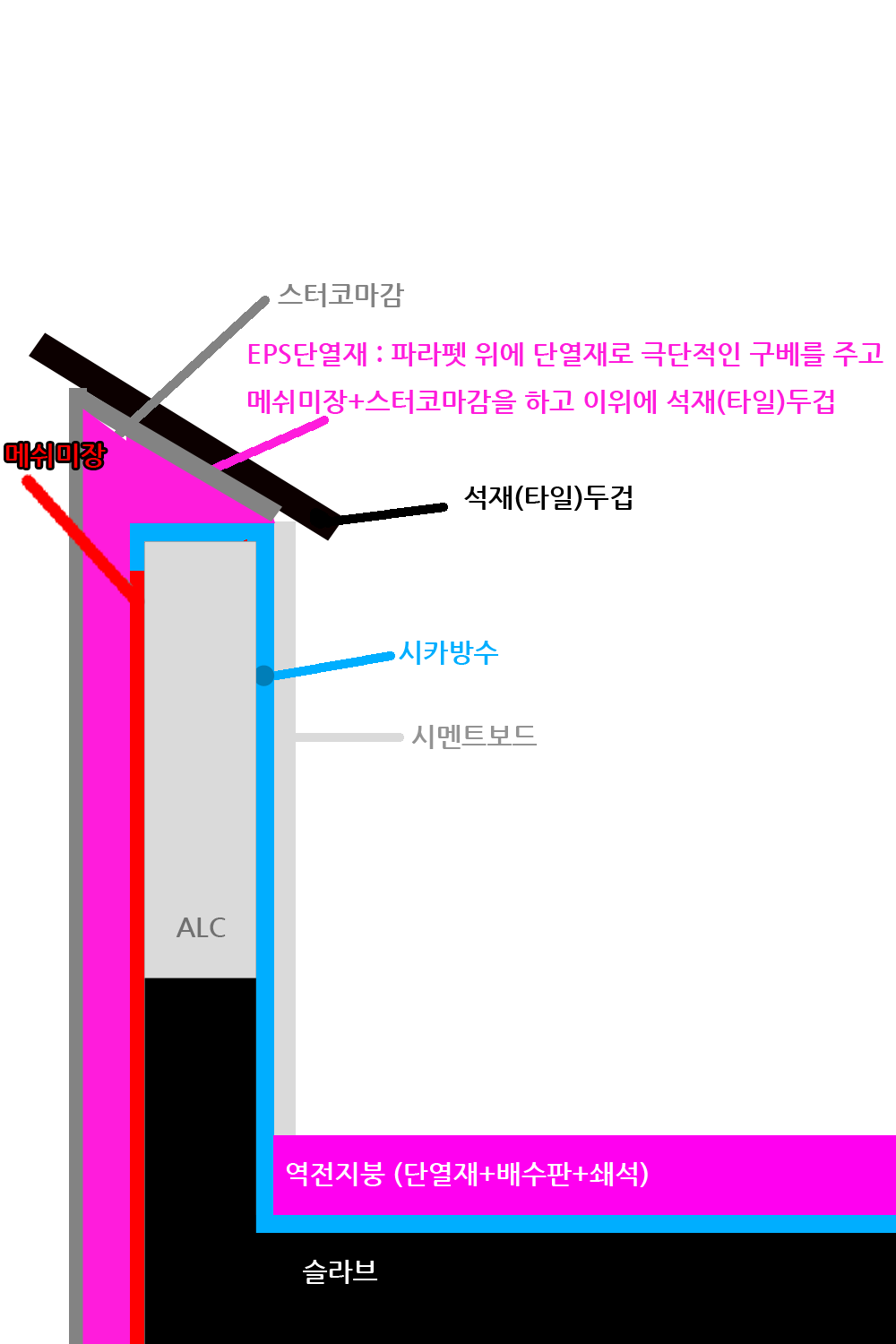 건축주가 옥상과 2층(첨부사진은 2층에 가깝고, 옥상은 외부단열재가 없습다.) 파라펫의 두겁을 처음에는 징크로 하려고 했는데, 협회에서 추천하는 방식의 업체를 도저히 구할수가 없어서 차라리 석재두겁으로 하고, 계속 관리를 하겠다는 입장으로 바뀌었습니다. 첨부사진을 보시면 아시겠지만, 확실한 구배를 위해서 단열재에 극단적인 구배를 주고 그위에 메쉬미장을 하고 스터코롤 마감을 한뒤에 석재(타일)두겁을 하려는건 어떻게냐고 문의를 주시는데요. eps를 두겁에 부착하고, 다시 석태(타일)두겁을 eps에 제대로 부착할 방법이 없고, 기껏 해봐야 폼인것 같은데... 아무리 생각해도 안될것 같아서요. 어짜피 벽체에도 단열을 하지 않으신다고 하는데... 차라리 파라펫 상부에는 단열재와 메쉬미장 스터코를 하지 않고, 시카방수를 하고 바로 그위에 석재(타일)두겁을 아크릴계열의 타일전용 접착제로 적당한 구배를 두고 부착하는것이 나을것 같은데요. 그나마 둘중 어떤게 나은 방법일까요?