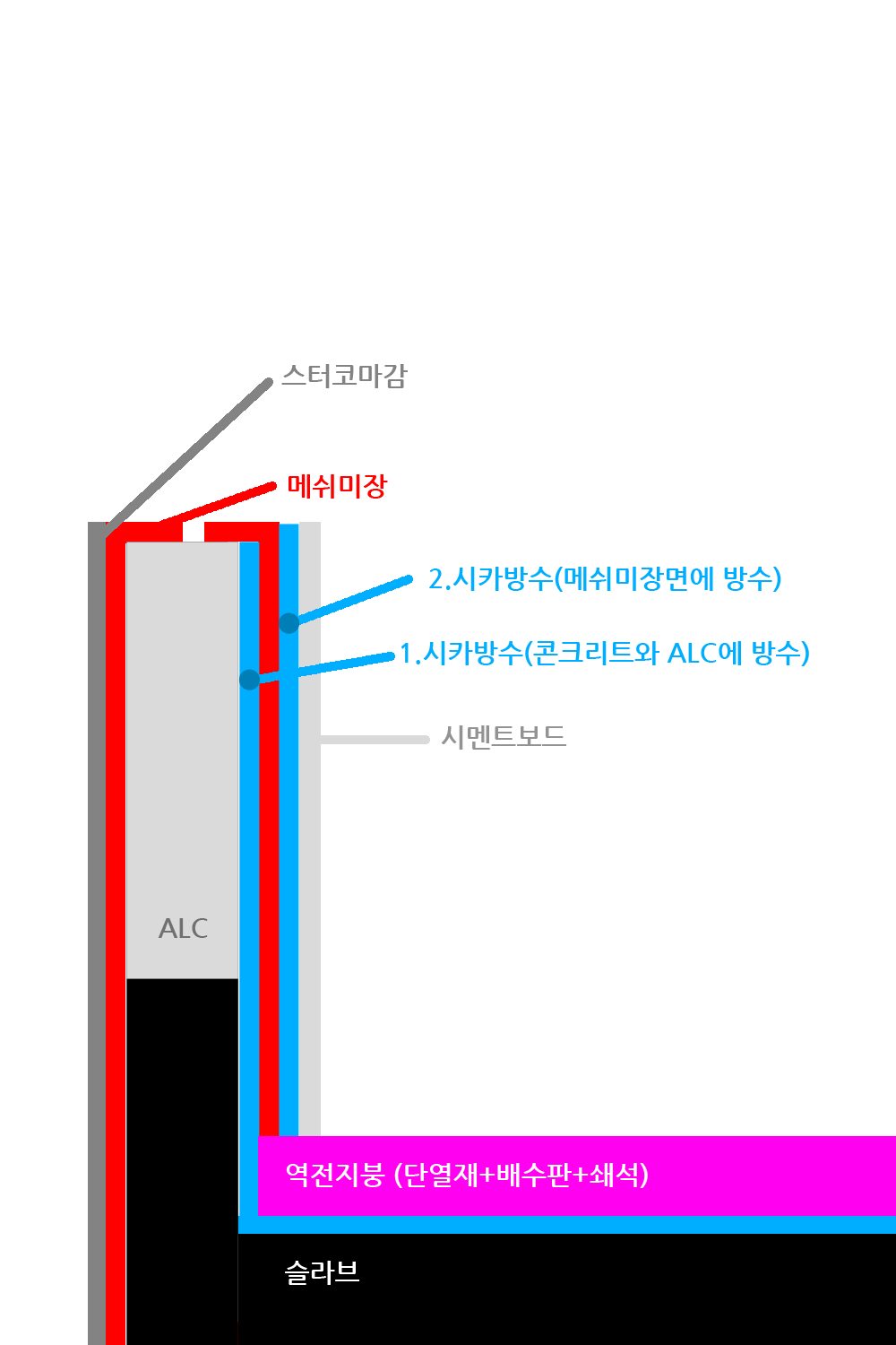 그러므로 ALC 수지미장만 하고, 그 표면에 도막방수 후 시멘트보드 시공을 하면 됩니다.