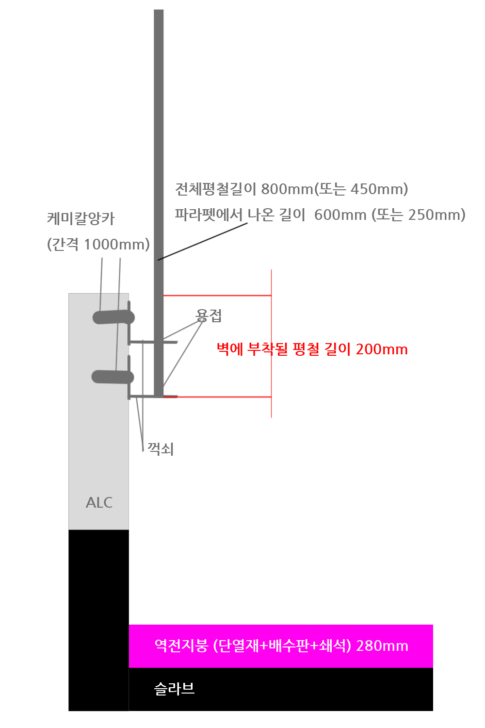 도면의 그림처럼 800mm길이의 평철로 200mm정도만 ALC벽체에 꺽쇠로 아래위에 케미칼앙카로 고정한후에 평철과 용접을 해서 난간을 만들려고 합니다. 그리고, 케미컬앙카는 1000mm간격으로 고정하고요.