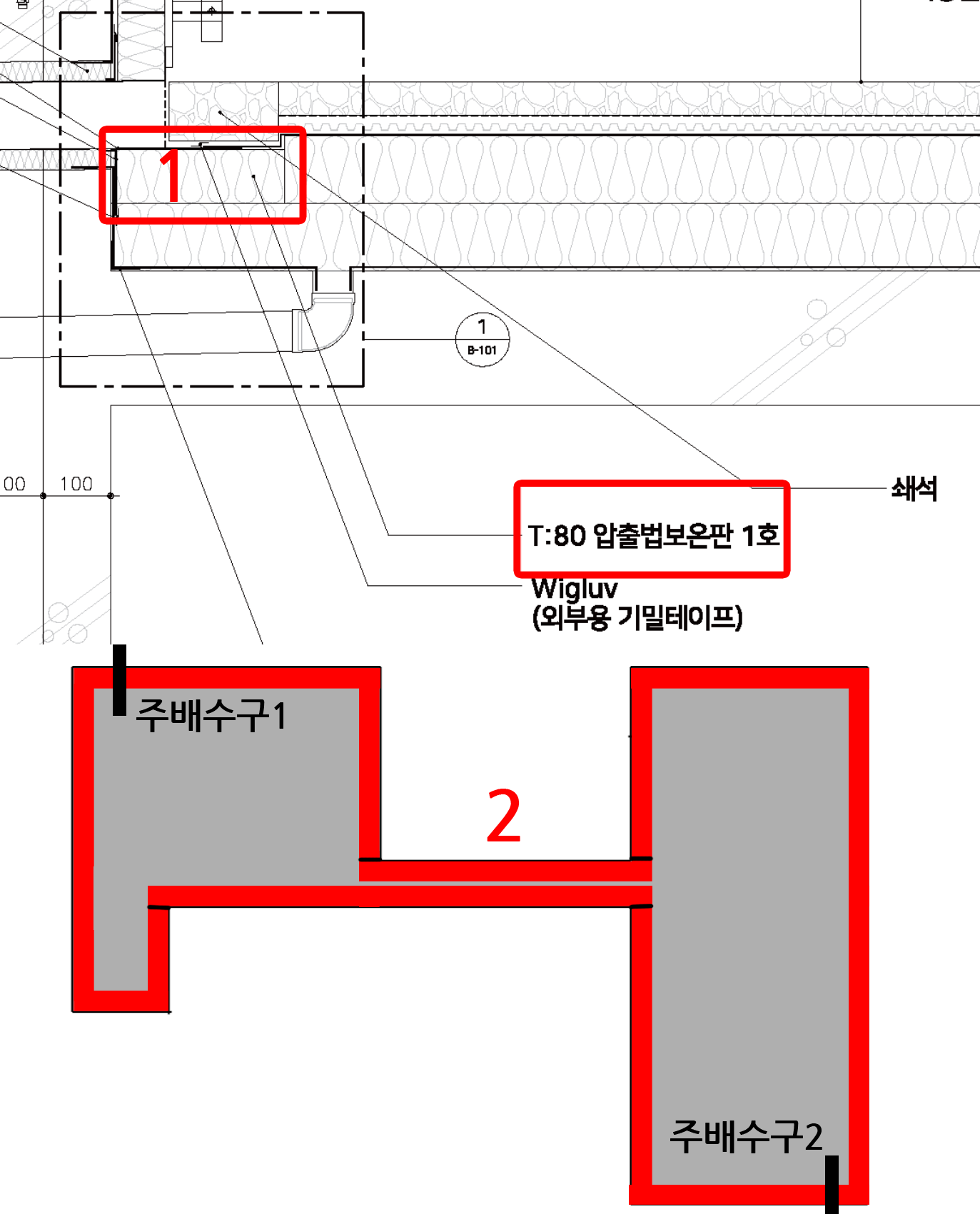 질문2 : 잡자재의 도면아래에 있는 도면이 역전지붕을 할 곳인데요. 130높이의 단열재를 깔아야 하는곳은 도면의 붉은 부분이라고 이해하고 있는데요. 도면의 2의 부분은 폭이 600입니다. 만약에 300폭으로 130높이의 단열재를 깔면 그 부분은 푹 꺼지게 됩니다. 그렇게 해도 되는건가요? 아니면 도면에 표시한 검은색줄내부만큼은 130이 아닌 150높이의 단열재를 깔면 되는걸까요?