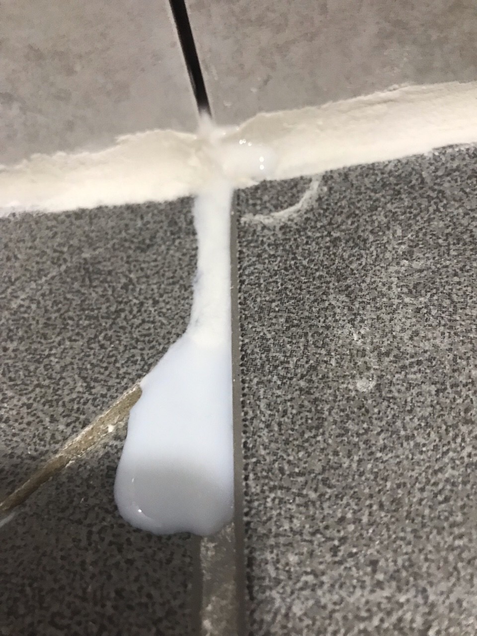 타일 사이에서 유출되는 액체가 우유와 같은 유탁형인 것으로 보아 접착제에 함유된 물이 흘러내리는 것으로 여겨집니다.