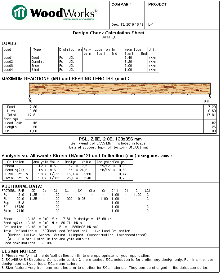 PSL 경간표는 외력(고정하중,적재하중,풍하중 등)이 정확히 반영되지 않습니다.가령 지붕 구성이 2x12 ? 혹은 2X 10 ? ,사용보온재가 서까래 사이에 삽입된다면 보온재의 밀도 , 지붕 마가재 슁글?혹은 기와? 에 따라 단면이 133 x356mm인 PSL이 너비 8m (등분포 하중 영역 4m) 인 박공지붕의 마루보로 사용가능 지간거리가 달라 집니다.그러니 지붕 구성도와 사용마감재를 알아야합니다.