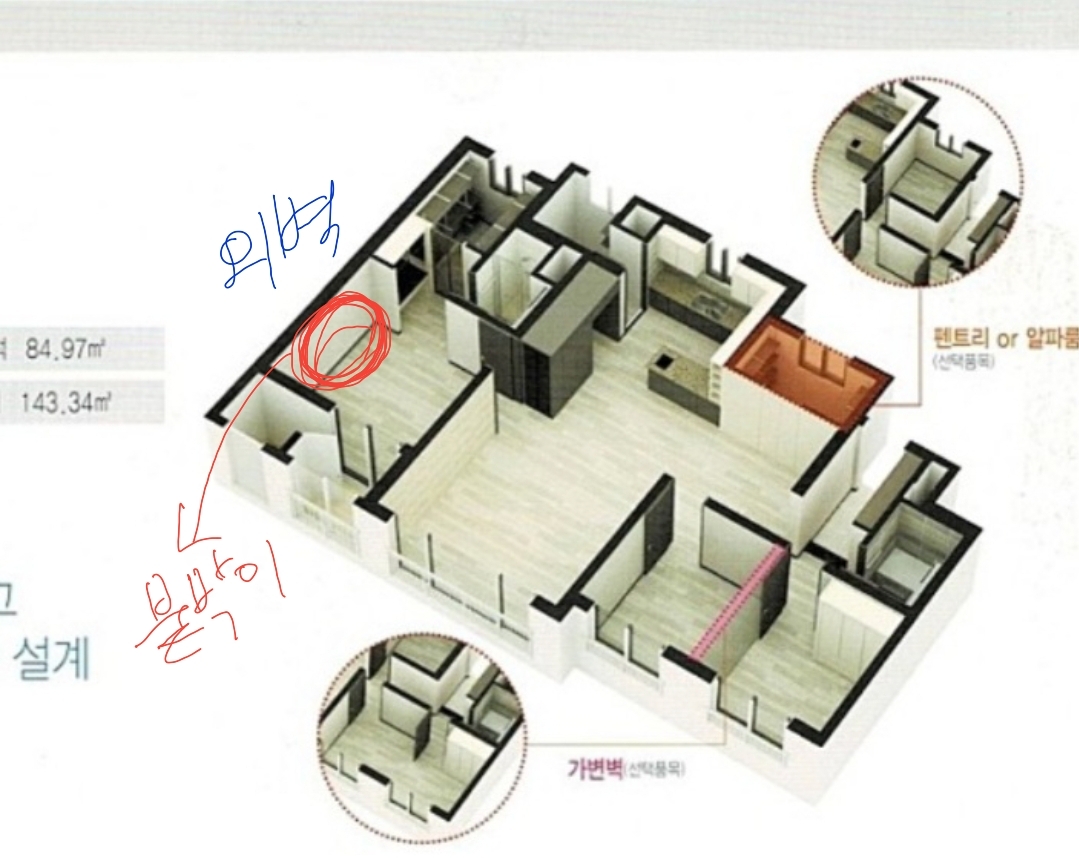 거기에 더해서, 외벽과 내벽이 연결된 부분의 열교 (욕실과 발코니 벽체 중 붙박이 장에 덮히는 부분)까지 같이 처리되어야 하므로, 공사범위가 생각보다 넓습니다.