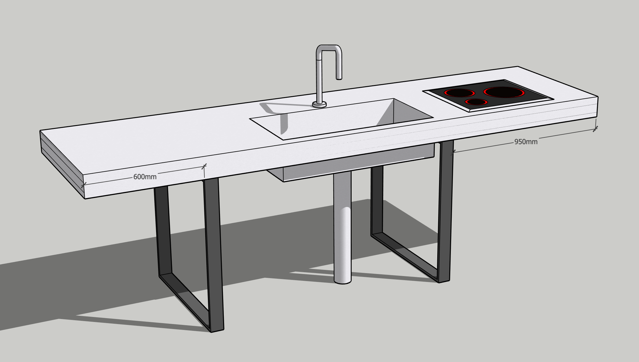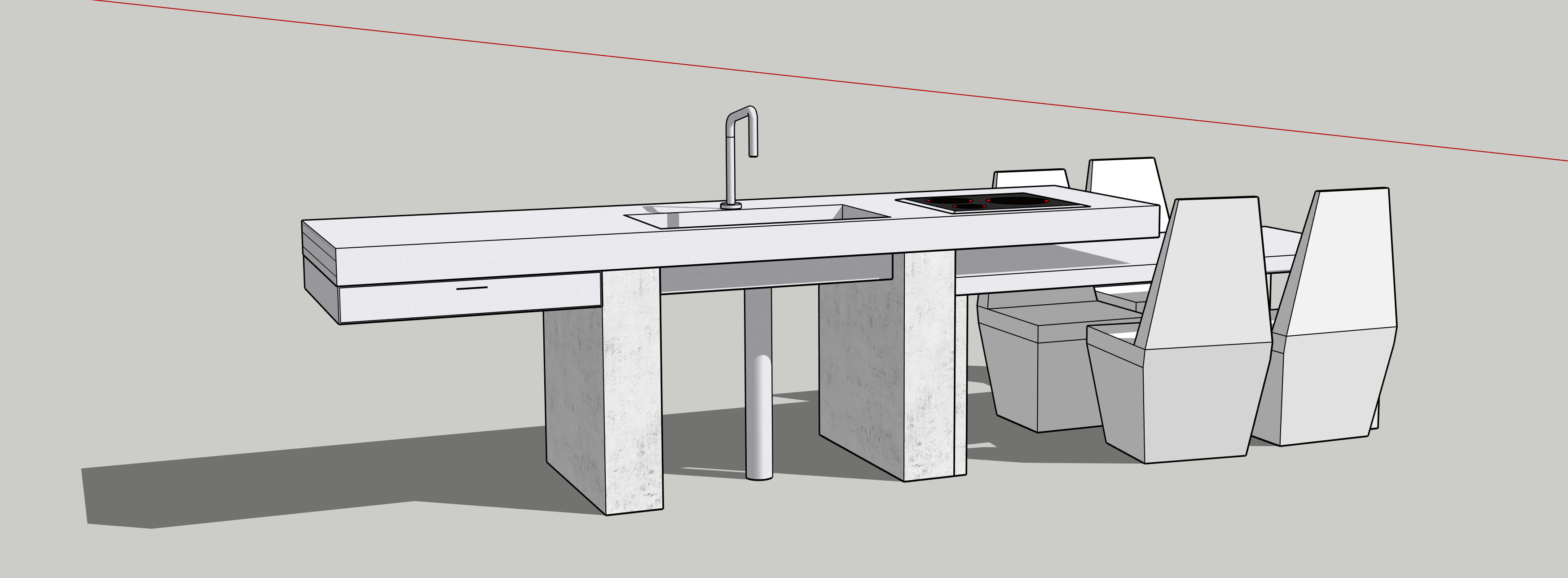완성하면 이런모습이 됩니다. 캔틸레버 상판보다는 이런식으로 식탁을 그냥 다리를 다 달고 2미터정도로 해서 평소엔 아일랜드 하부에 집어넣어서 쓰다가 손님이 있을때 길게 뽑아서 쓰는방식으로 쓰기로 계획을 변경했습니다.