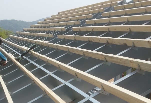 지붕 :  OSB 합판 - 방수쉬트 - 리얼징크