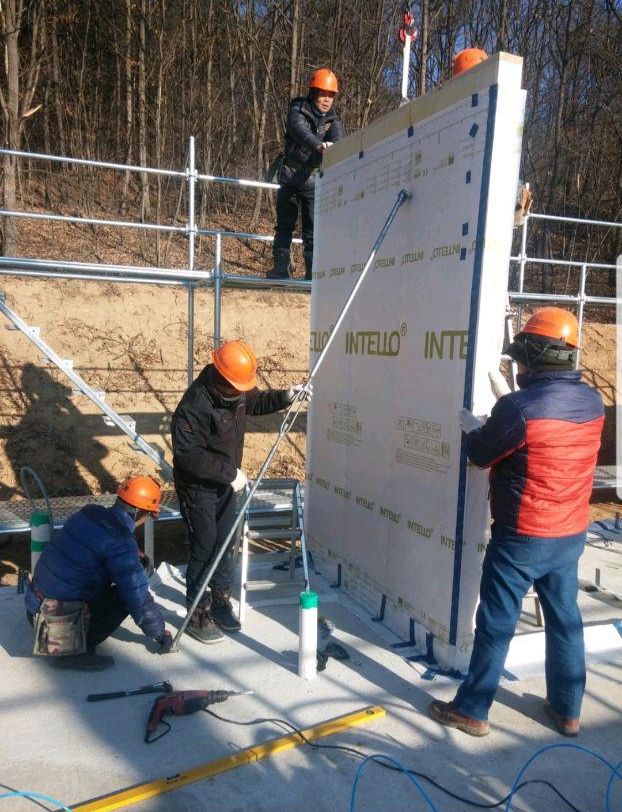 표준주택 공사 중 패널라이징으로 벽체를 조립할때 보면 일반적인 경량목조주택 현장처럼