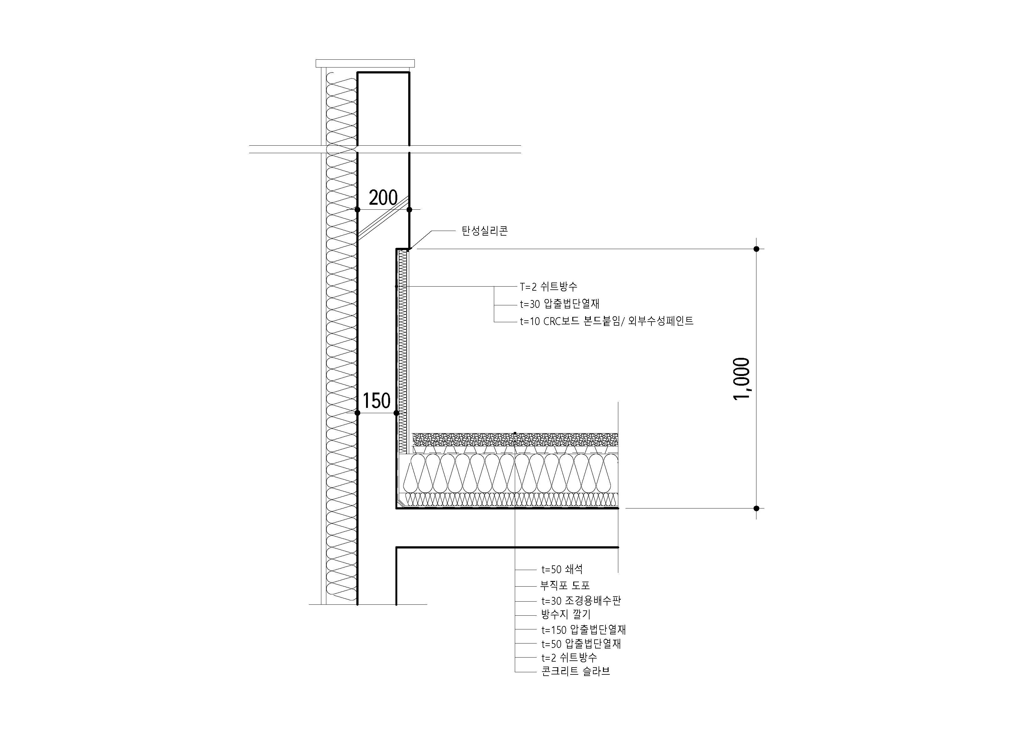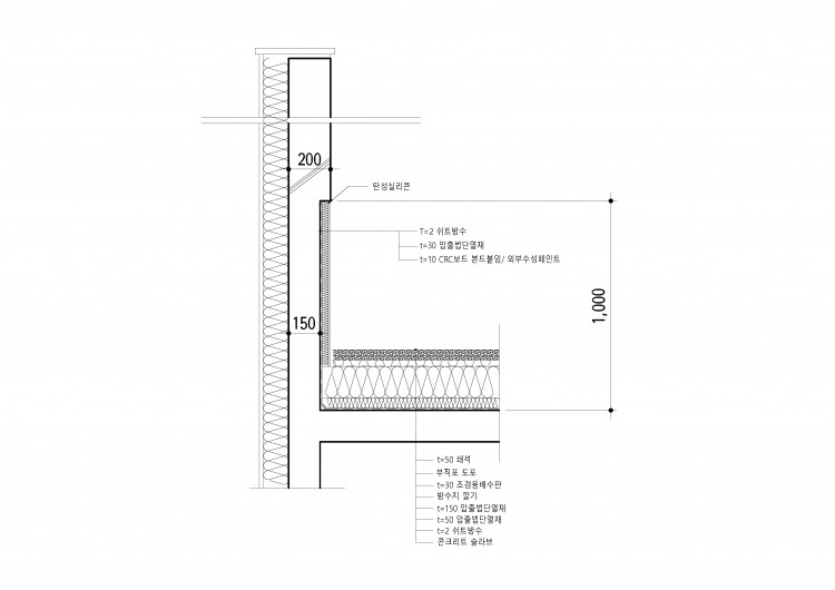 그럼 300MM 이상 도막방수 치켜올림 하고 50MM단열재 생략하고 CRC보드 본드접착후 수성페인트 상세는 괜찮을까요