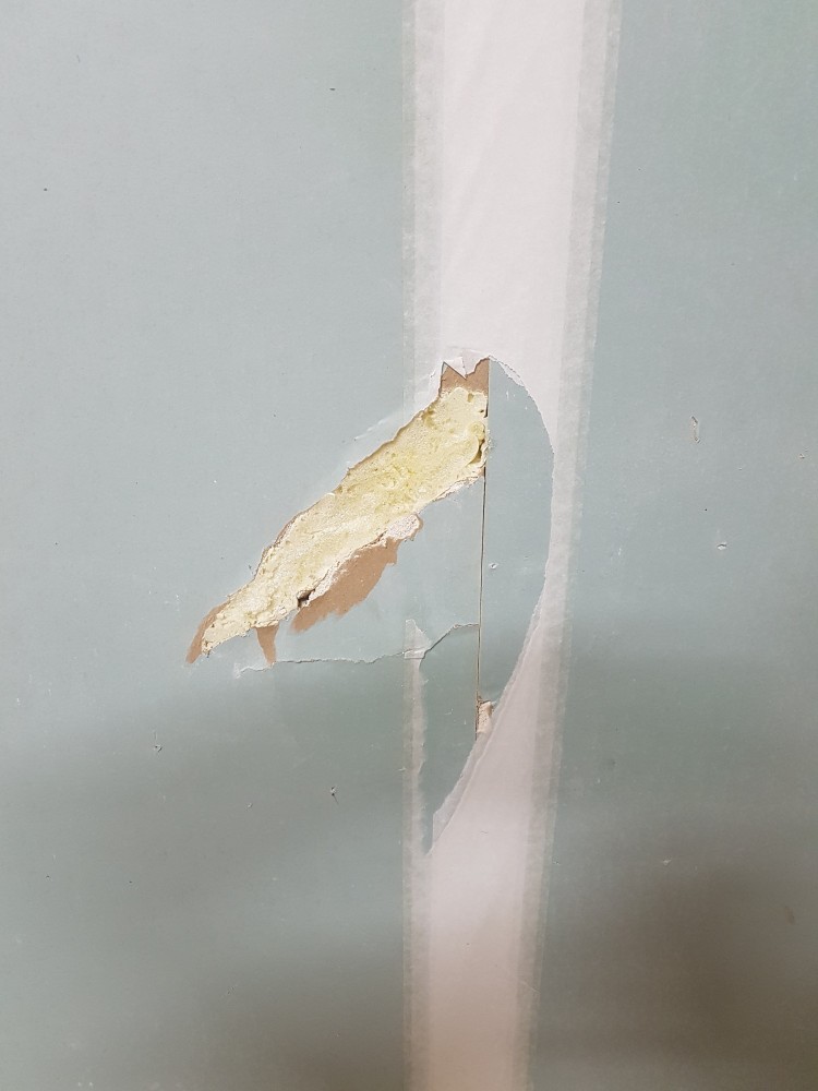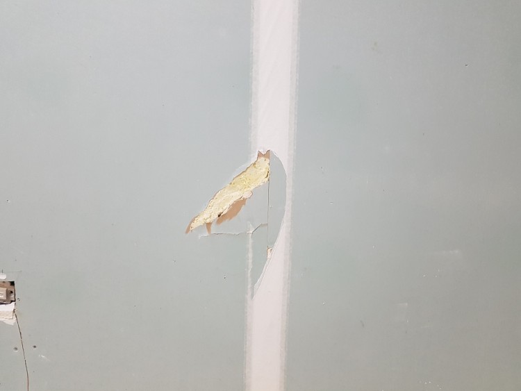 혹시나 해서 벽지를 뜯어보니 사진과 같이 아파트 건설시 석고보드를 이런식으로 땜방 해놨습니다.