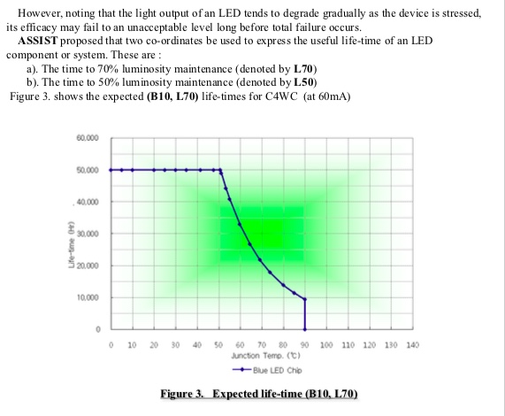 LED 온도가 50도에서 60도로 올라가면 거의 20,000시간의 수명이 줄어듭니다.