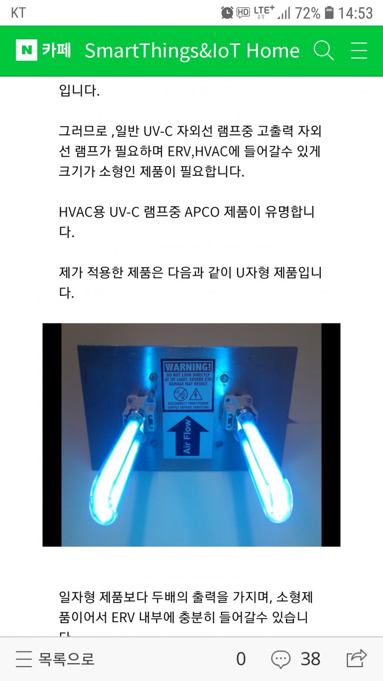 이런점 때문에 저는 고 와트의 램프를 사용치 않고  9watt UV-C 램프 2개를 ERV내부에 설치했습니다.