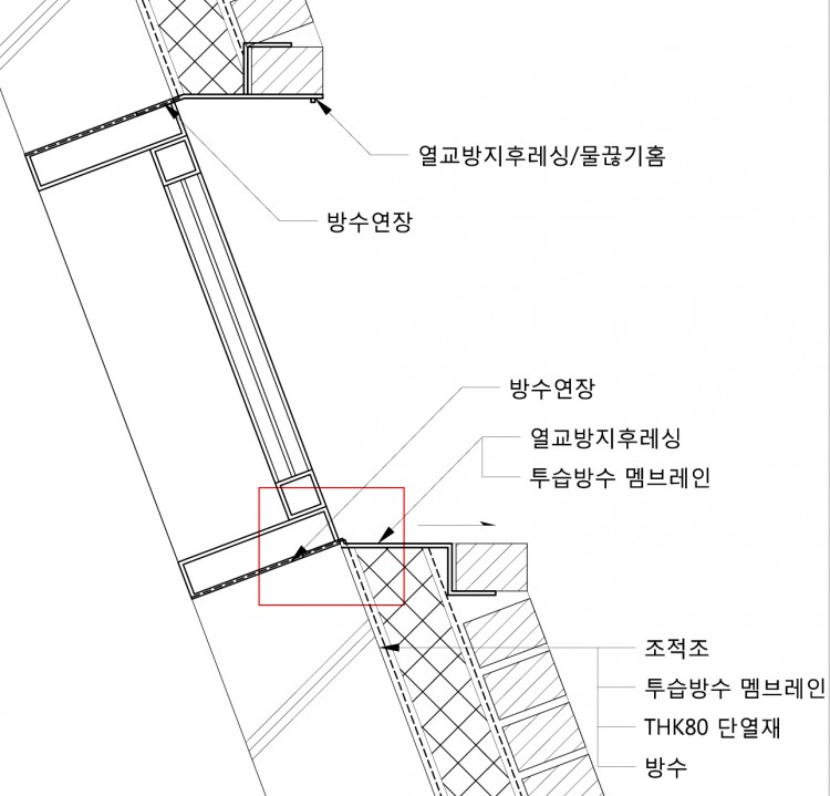 현재 설계에 적용된 개념은 단열의 누락을 방지하고자 창틀주변에 금속후레싱 처리를 하였습니다. 자문을 요청드리는 부분은 후레싱 처리부분과 창틀이 만나는 부분을 코킹으로 처리하고자 하는데 시간이 흐른후 코킹 내구성이 떨어졌을때 하자가 발생할 우려가 있지 않을까해서 입니다. 아무래도 경사벽체다 보니 우려가 되는 부분입니다. 전문가분들의 고언 부탁드립니다.
