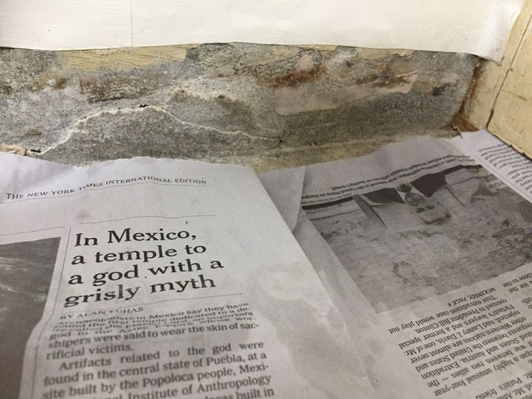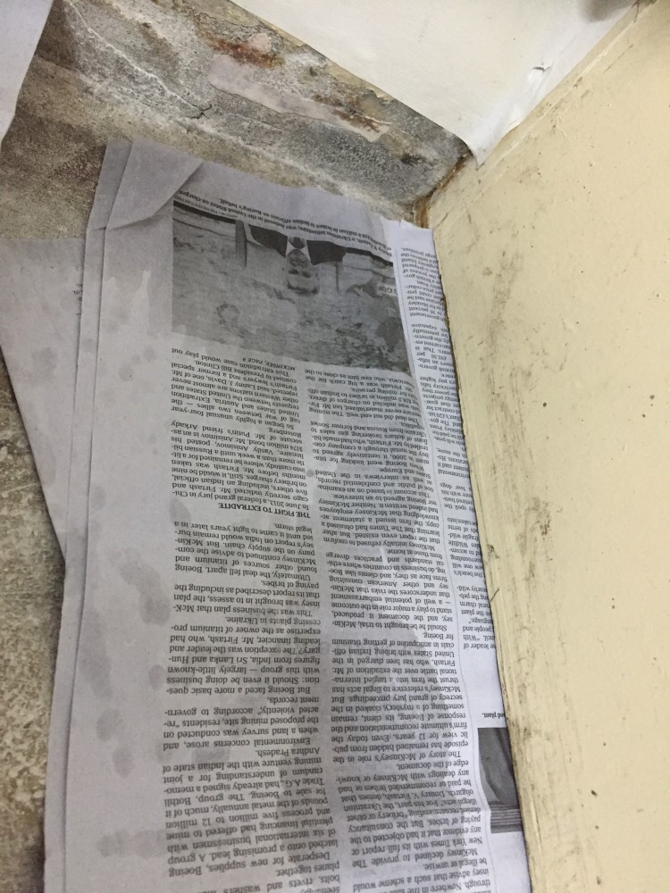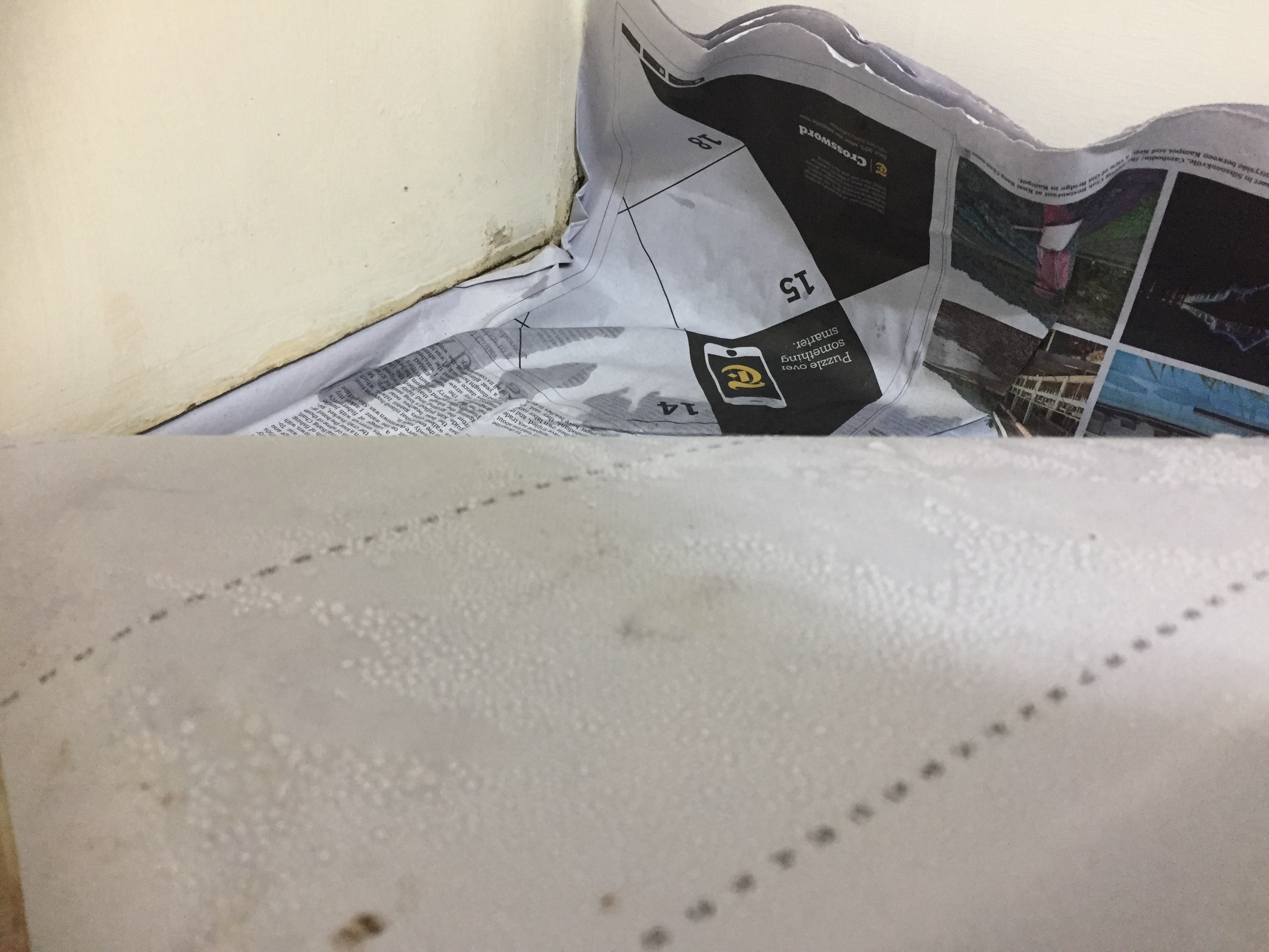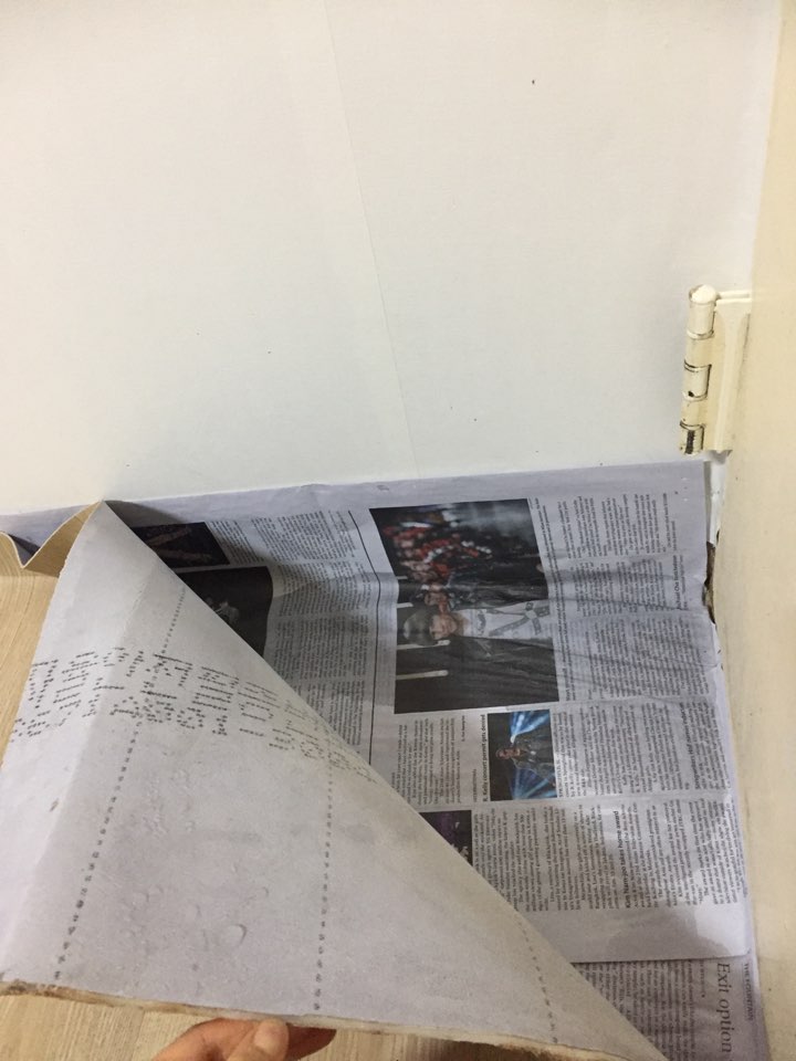 지금은 곰팡이 있던 바닥과 벽 싹 다 청소하고 며칠 장판 들어올린채로 말린 후 그 자리에 신문지를 깔고 장판을 다시 깔아둔 상태입니다. 한 이 삼일에 한번씩 장판을 들어서 체크를 해보면 사진처럼 장판과 신문지에 물이 묻어있습니다.