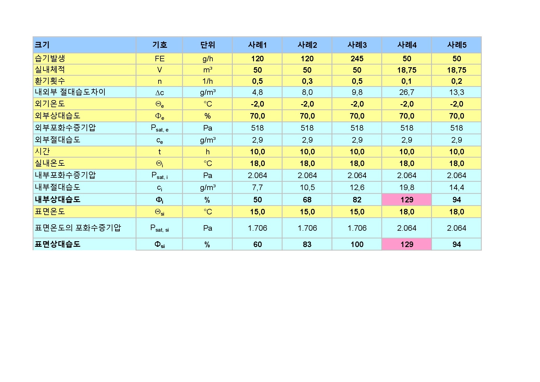 사례 4와 5는 드레스룸으로 환기가 거의 없다고 가정하고 단지 구조체의 sorption을 통한 수증기의 증발만을 고려한다면 129%로 되어 있지만 100%이상은 없기에 결로조건이 됩니다. 이때 두경우 모두 내부표면온도를 18도로 봤습니다.