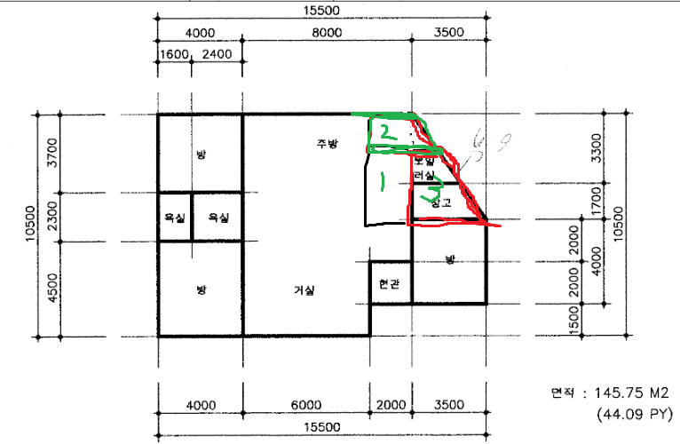 아 그리고 현재는 아래 첨부 그림처럼 배치가 조금 바뀌어 있어요. 그림에서 1은 세탁실이고 주방에서 접근 가능하고요. 2는 작은 방으로 옷장이 붙박이로 있고요. 역시 주방에서 접근 가능하고 3부분은 보일러실인데 밖에 철문이 되어 있어서 그리고 접근합니다. 감사합니다~