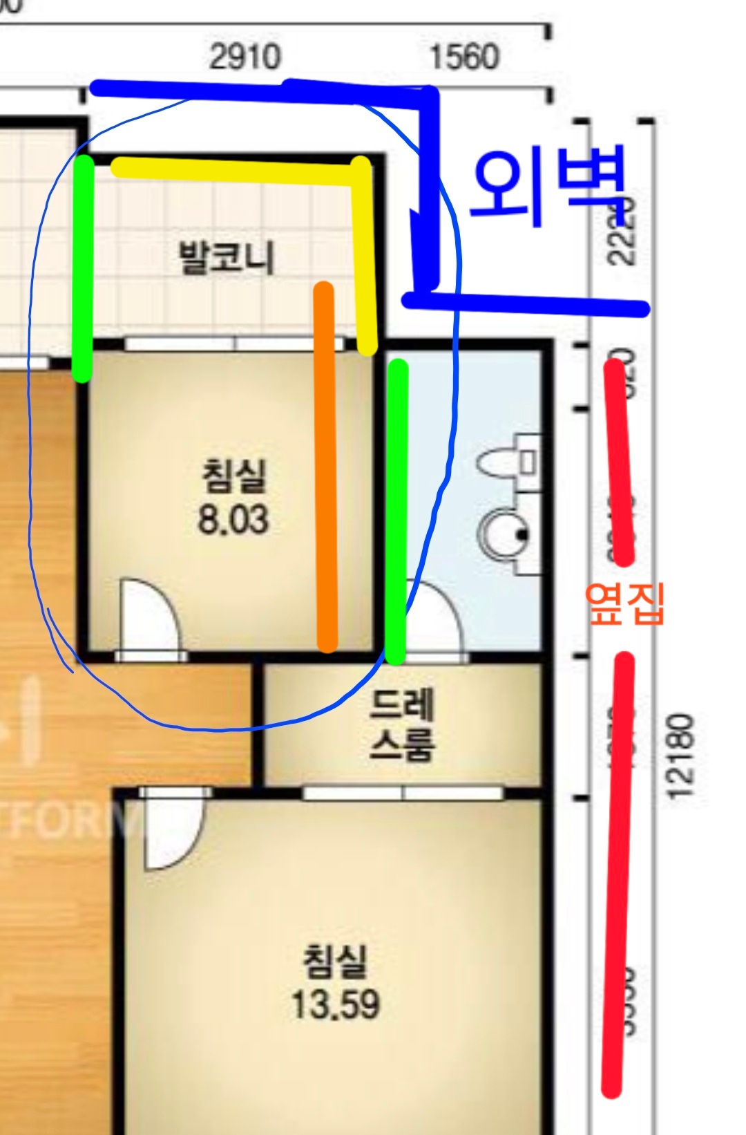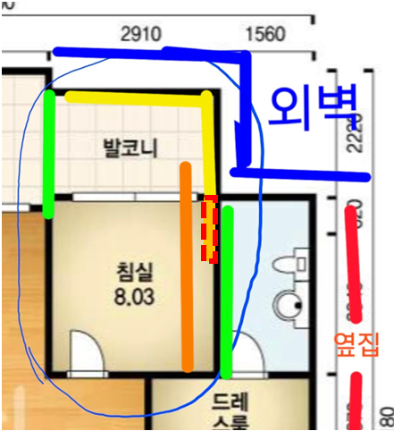 선생님이 말씀하신거처럼 왼쪽 초록색 선벽은  다른외벽(노란선)괴 같은두께로 하라고 하시는데 그쪽벽은 외벽이아니여도 100t 해야하는건가요? 주방베란다벽이라 30t만 해도 되지않을까요?