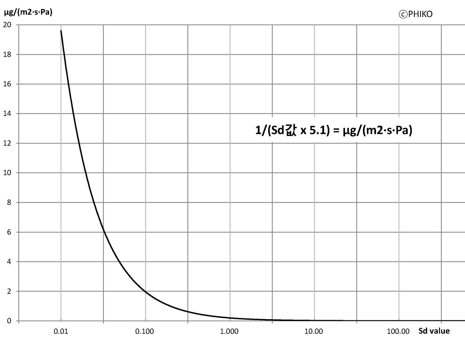 Sd값에 따른 습기 투과량 (g)의 추이 그래프를 보면.. 이게 기하급수형태로 줄어 든다는 것을 알 수 있습니다.