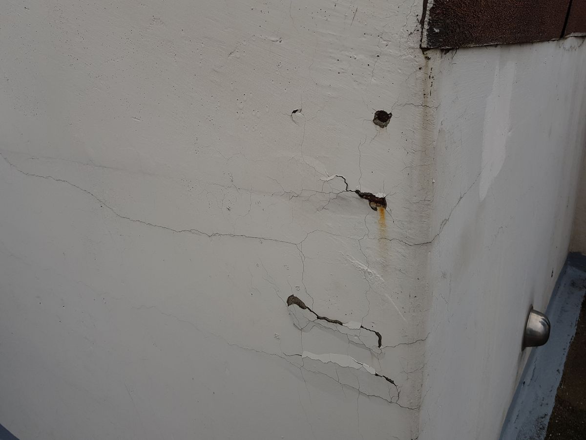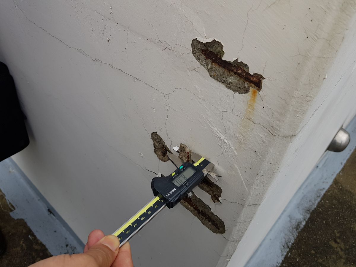 사진 왼편에서 보는 것과 같이 철근콘크리트 구조체에서 수평균열이 일정하게 발생했다면 외측 수평철근 피복두께가 얇은 것은 아닌지 확인해 볼 필요가 있습니다.