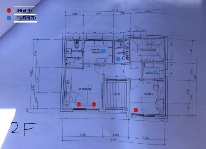 2) 냄새, 먼지발생, 음식물조리, 세탁룸에 배기를 배치 + 거실, 침실, 계단, 복도 등에 급기를 배치