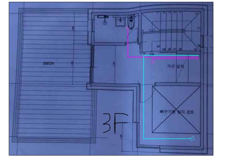 도면상 3층에 화장실이 있지만 화장실로 만들지 않고 벽없이 그냥 공간으로 두었고 그 옆으로 보일러가 들어가게 되어있어 본체는 보일러 옆에 설치하려고 합니다.